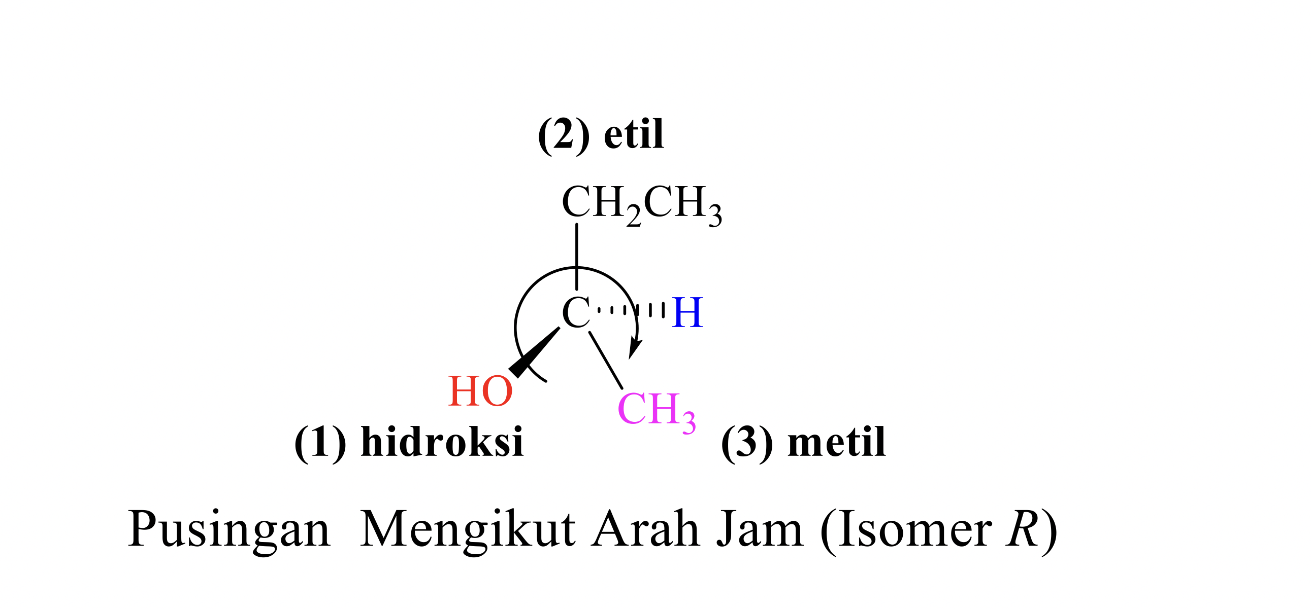 Dalam contoh 2-butanol, kumpulan yang paling utama adalah hidroksi (1) kerana mempunyai nombor atom yang paling besar dan diikuti dengan etil (2), metil (3) dan hidrogen (4) yang mempunyai nombor atom yang paling kecil. Disebabkan hidrogen adalah yang paling kurang keutamaan, ia disusun pada arah belakang. Jika pusingan keutamaan yang bermula daripada hidroksi, kemudian etil dan diakhiri dengan metil adalah mengikut arah jam, maka isomer tersebut dikelaskan sebagai jenis (R). Sebaliknya jika pusingan keutamaan melawan arah jam, maka isomer tersebut adalah kelas (S).