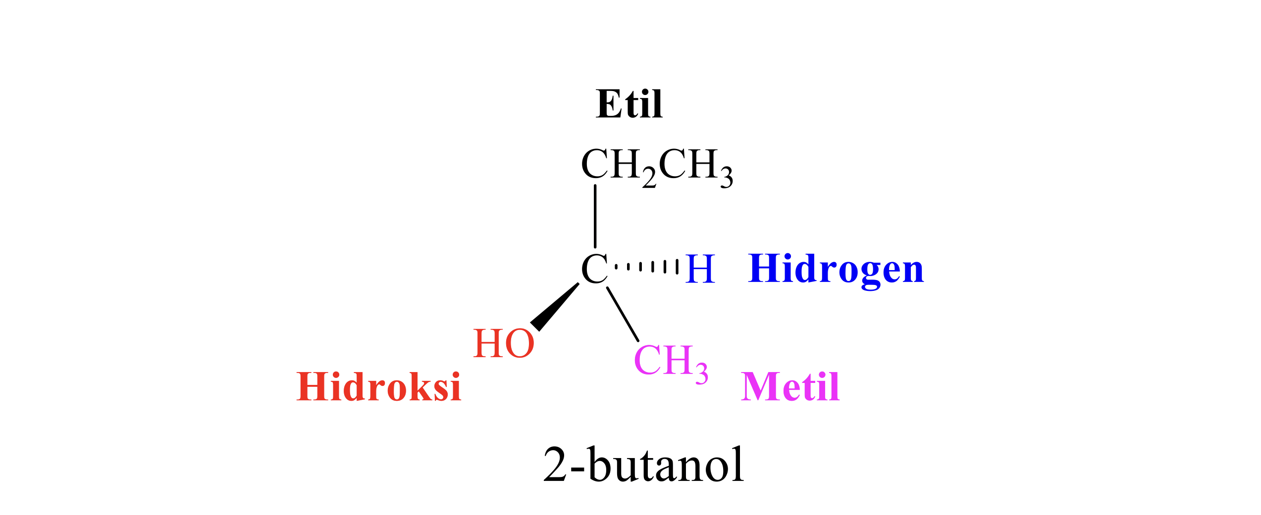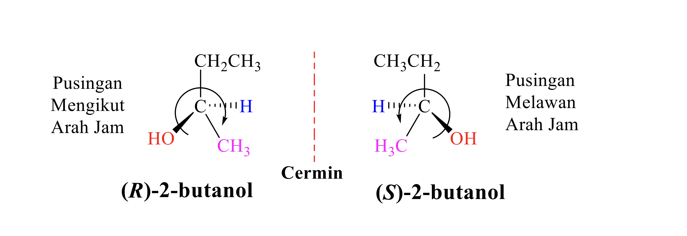 Bagi sebatian 2-butanol, atom karbon ini merupakan karbon kiral kerana ianya terikat dengan empat kumpulan berbeza iaitu hidroksi, etil, metil dan hidrogen. Dalam ruang tiga dimensi, isomer ini boleh dikelaskan berdasarkan penyusunan empat kumpulan berbeza tersebut. Keutamaan diberikan kepada kumpulan yang mempunyai nombor atom yang paling besar dan kumpulan paling kurang keutamaan adalah kumpulan yang mempunyai nombor atom yang paling kecil yang diletak pada arah belakang.