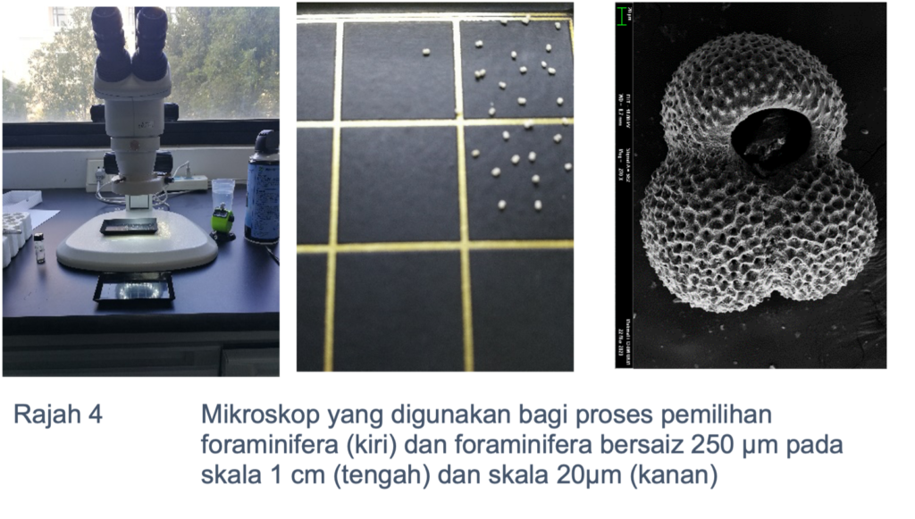Kesemua sampel ini kemudian diproses dan disiapkan untuk analisis geokimia foraminifera. Sebelum kita menjalankan analisis ini, kita perlu memilih dahulu spesies dan kuantiti foraminifera yang kita inginkan. Proses pemilihan dilakukan menggunakan mikroskop dan perlu dilakukan dengan teliti kerana kadangkala sampel yang diperolehi adalah sangat terhad.