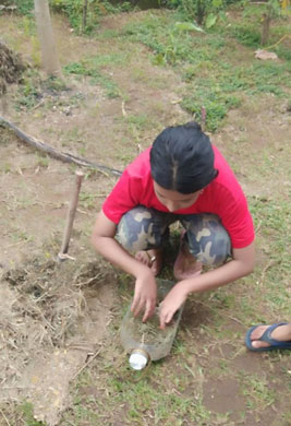 Potong bekas jika perlu dan isikan dengan batu kerikil dan rumput kering