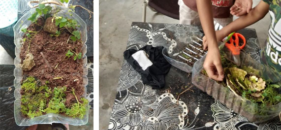 Masukkan tanah kebun. Kemudian tanam lumut dan tanaman kecil pilihan anda