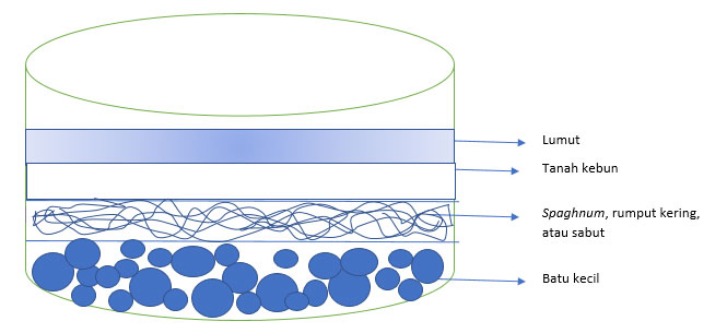 Panduan susun atur batu kecil, Spaghnum, rumput kering, atau sabut, tanah kebun dan lumut