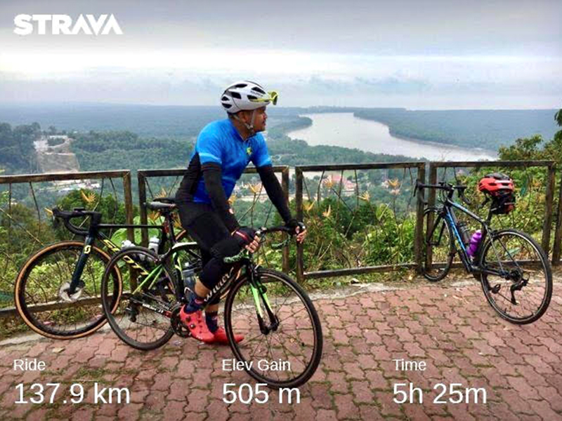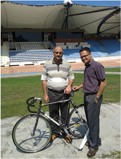 Penulis (kanan) bersama mantan pelajar Ph.D. (kiri) sewaktu ujikaji prestasi rangkaian tanpa wayar bagi prototaip Internet Basikal di Stadium Velodrome, Cheras pada tahun 2014