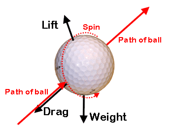 When air moves around any object, it exerts force. An object with an aerodynamic shape breaks this force into two components: lift and drag. Drag, as its name suggests, opposes the motion, while lift acts in a direction perpendicular to the motion. In the case of the golf ball, lift acts upward since the motion is forward.