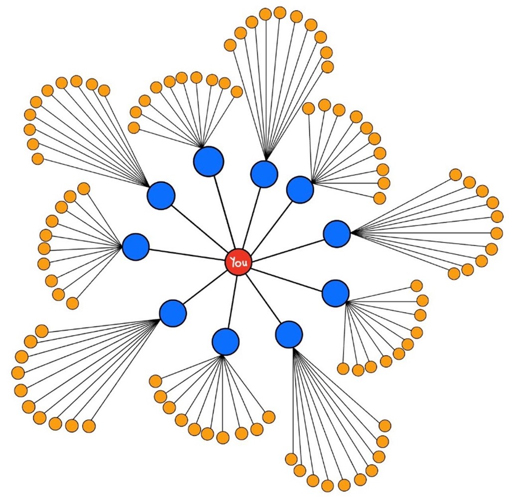First, we must comprehend the six degrees of separation theory and how our connections can rapidly multiply. Think about your network of friends. Imagine you have ten friends who know another ten people, and so on. At one degree of separation, you could reach 10 people, whereas at two degrees of separation, you would be able to reach 10 x 10 or 10² = 100 people. This is because each of your 10 friends knows another 10 people, enabling you to be connected to 10 + 10 + 10 + 10 + 10 + 10 + 10 + 10 + 10 + 10 = 100 people.