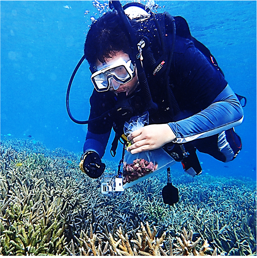 Saintis yang menyelam sedang mengutip siput pemakan karang yang terdapat pada karang bercabang, Acropora sp.